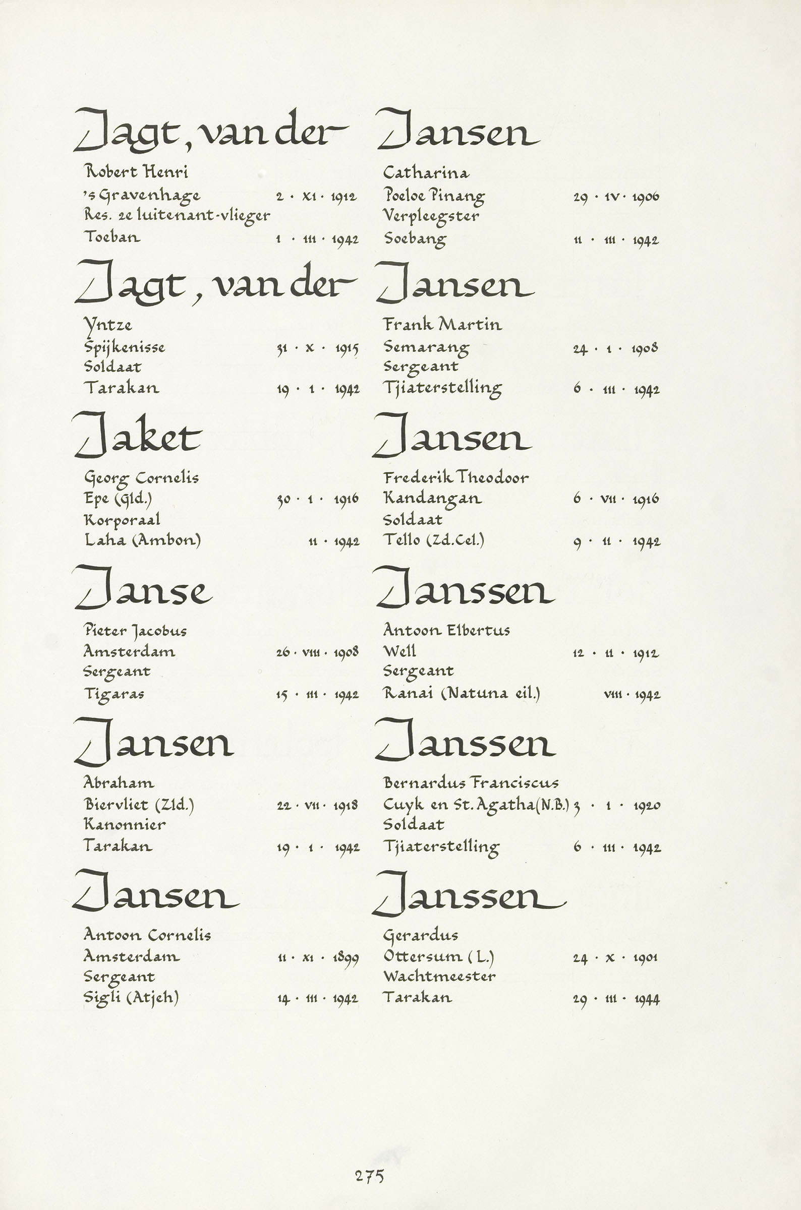Abraham Jansen Geboortedatum: 22-07-1918 Geboorteplaats: Biervliet (Zld) Datum van overlijden: 19-01-1942 Plaats van overlijden: Tarakan (Borneo) Beroep: Kanonnier Groep: Koninklijk Nederlands-Indisch Leger en Indisch Verzet Pagina: 275 Reactie toevoegen JavaScript moet ingeschakeld zijn om dit formulier te kunnen gebruiken. Comment Over tekstopmaak Platte tekst Geen HTML toegestaan. Regels en alinea's worden automatisch gesplitst. Web- en e-mailadressen worden automatisch naar links omgezet. Laat dit veld leeg blader download Permalink