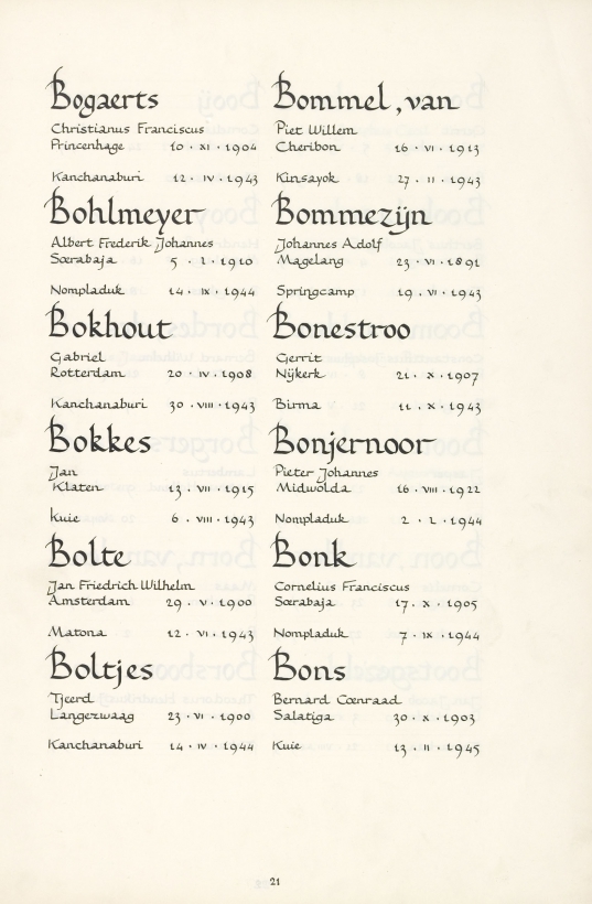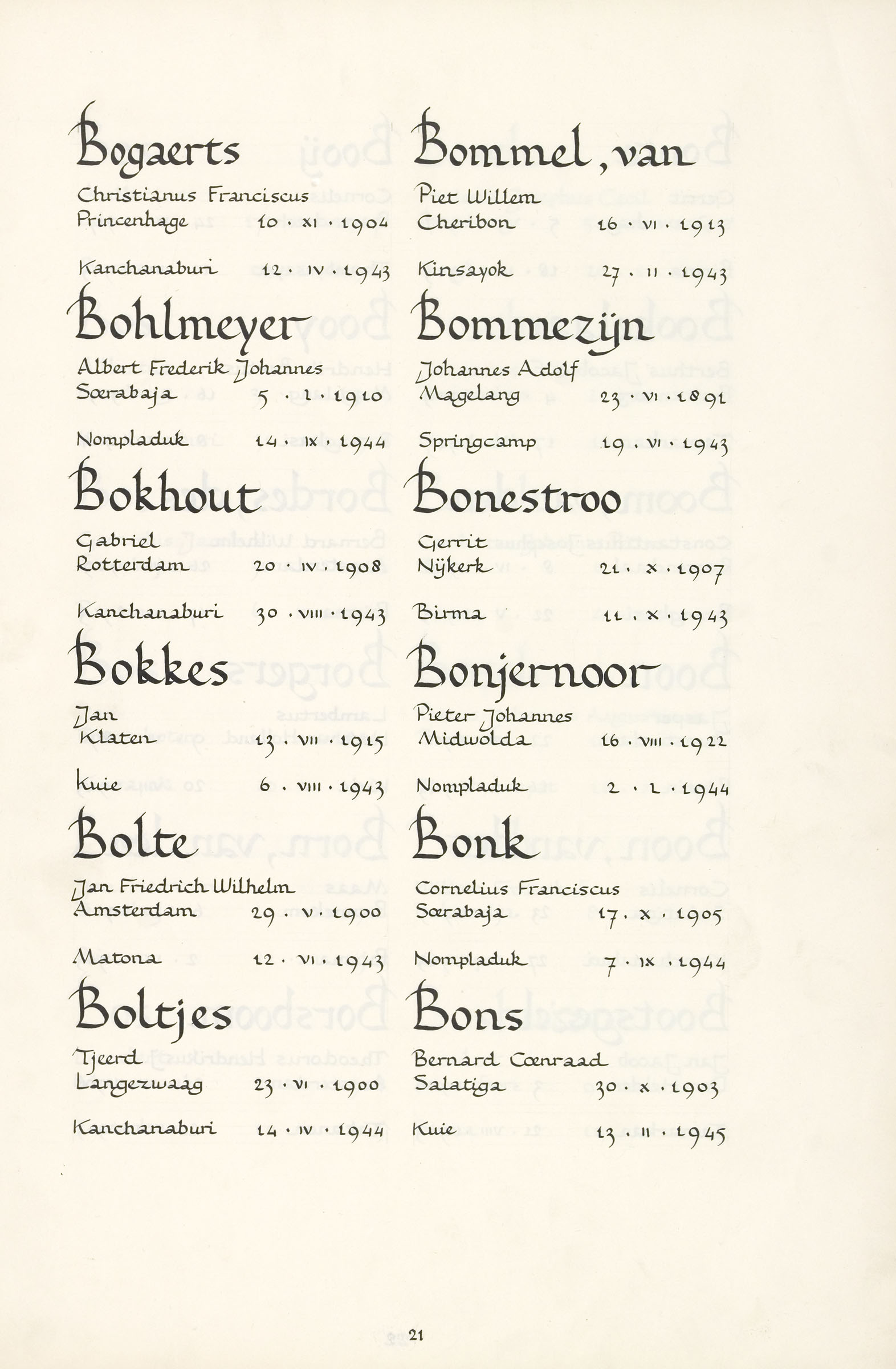 Albert Frederik Johannes Bohlmeyer Geboortedatum: 05-01-1910 Geboorteplaats: Soerabaja (Java) Datum van overlijden: 14-09-1944 Plaats van overlijden: Non Pladuk (Thailand) Beroep: Soldaat Groep: Koninklijk Nederlands-Indisch Leger en Indisch Verzet Pagina: 21 Reactie toevoegen JavaScript moet ingeschakeld zijn om dit formulier te kunnen gebruiken. Comment Over tekstopmaak Platte tekst Geen HTML toegestaan. Regels en alinea's worden automatisch gesplitst. Web- en e-mailadressen worden automatisch naar links omgezet. Laat dit veld leeg blader download Permalink