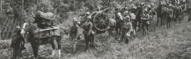 KNIL: een eenheid van het KNIL vervoert bergartillerie in Nederlands-Indiƫ in 1941.