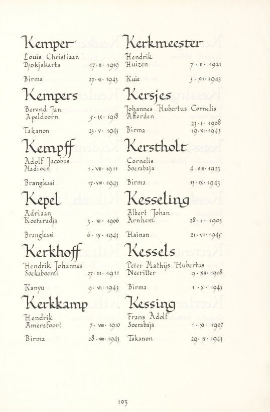 Frans Adolf Kessing Geboortedatum: 01-11-1907 Geboorteplaats: Soerabaja (Java) Datum van overlijden: 29-09-1943 Plaats van overlijden: Takanon (Thailand) Beroep: Soldaat genie Groep: Koninklijk Nederlands-Indisch Leger en Indisch Verzet Pagina: 103 Margie Spijkers-Kessing Dionne Kessing Jónó Kessing m.c.p Dolf Kessing Ben Kessing Gabrielle marcel v_d klugt Grace Kessing-van Schaik Raymond Kessing Roxanne Spijkers Izaak Pattiwael Eddy kessing Petra Kessing-vd Werf Maikel Kessing Jelita Kessing Tonkes Andre Iwona Nicky Casper Wally Tonkes Dave Kessing Judith Tonkes Jeroen en Lukas Mol sterkte! Wesley Jay Spijkers Reactie toevoegen JavaScript moet ingeschakeld zijn om dit formulier te kunnen gebruiken. Comment Over tekstopmaak Platte tekst Geen HTML toegestaan. Regels en alinea's worden automatisch gesplitst. Web- en e-mailadressen worden automatisch naar links omgezet. Laat dit veld leeg blader download Permalink