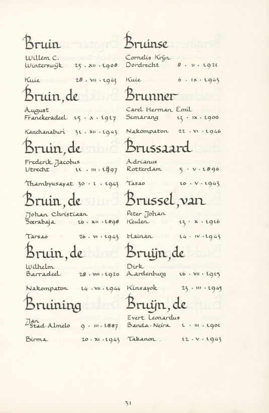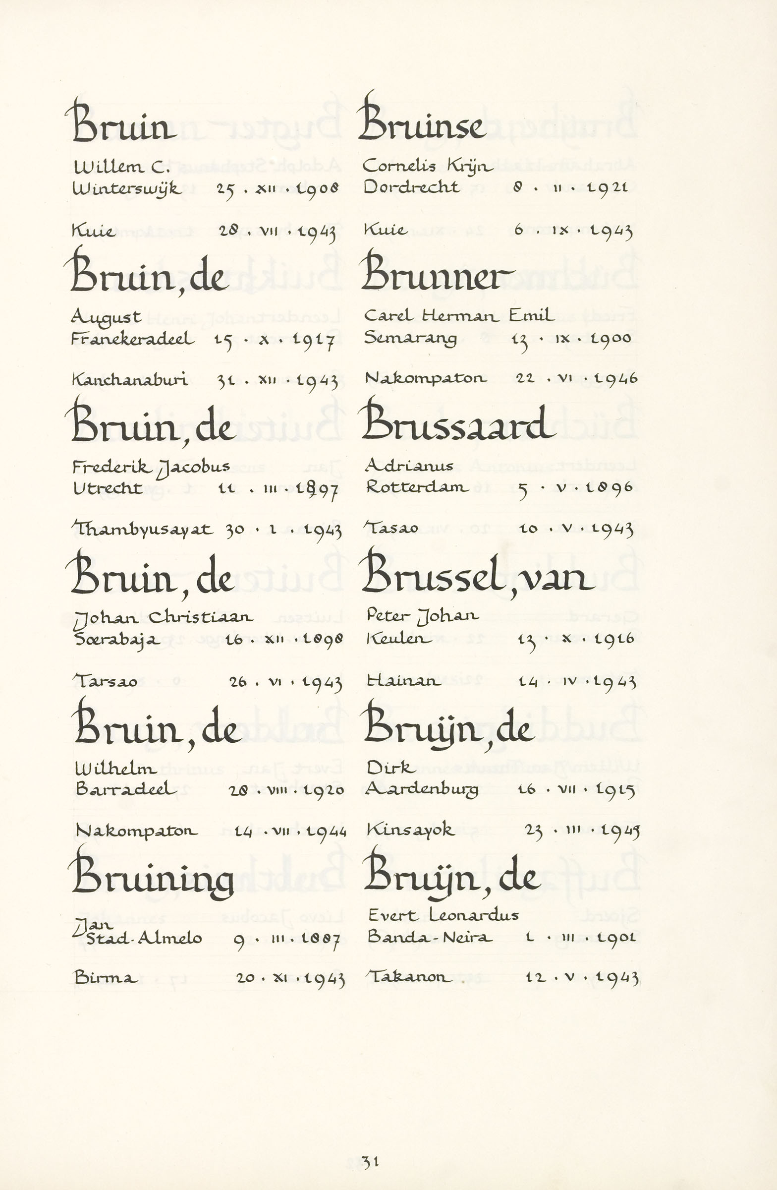 Frederik Jacobus de Bruin Geboortedatum: 11-03-1897 Geboorteplaats: Utrecht Datum van overlijden: 30-01-1943 Plaats van overlijden: Thambyusayat (Birma) Beroep: Soldaat Groep: Koninklijk Nederlands-Indisch Leger en Indisch Verzet Pagina: 31 de bruin g.m. Wil Mulder-de Bruin de Bruin W.J. Oscar Mulder Reactie toevoegen JavaScript moet ingeschakeld zijn om dit formulier te kunnen gebruiken. Comment Over tekstopmaak Platte tekst Geen HTML toegestaan. Regels en alinea's worden automatisch gesplitst. Web- en e-mailadressen worden automatisch naar links omgezet. Laat dit veld leeg blader download Permalink