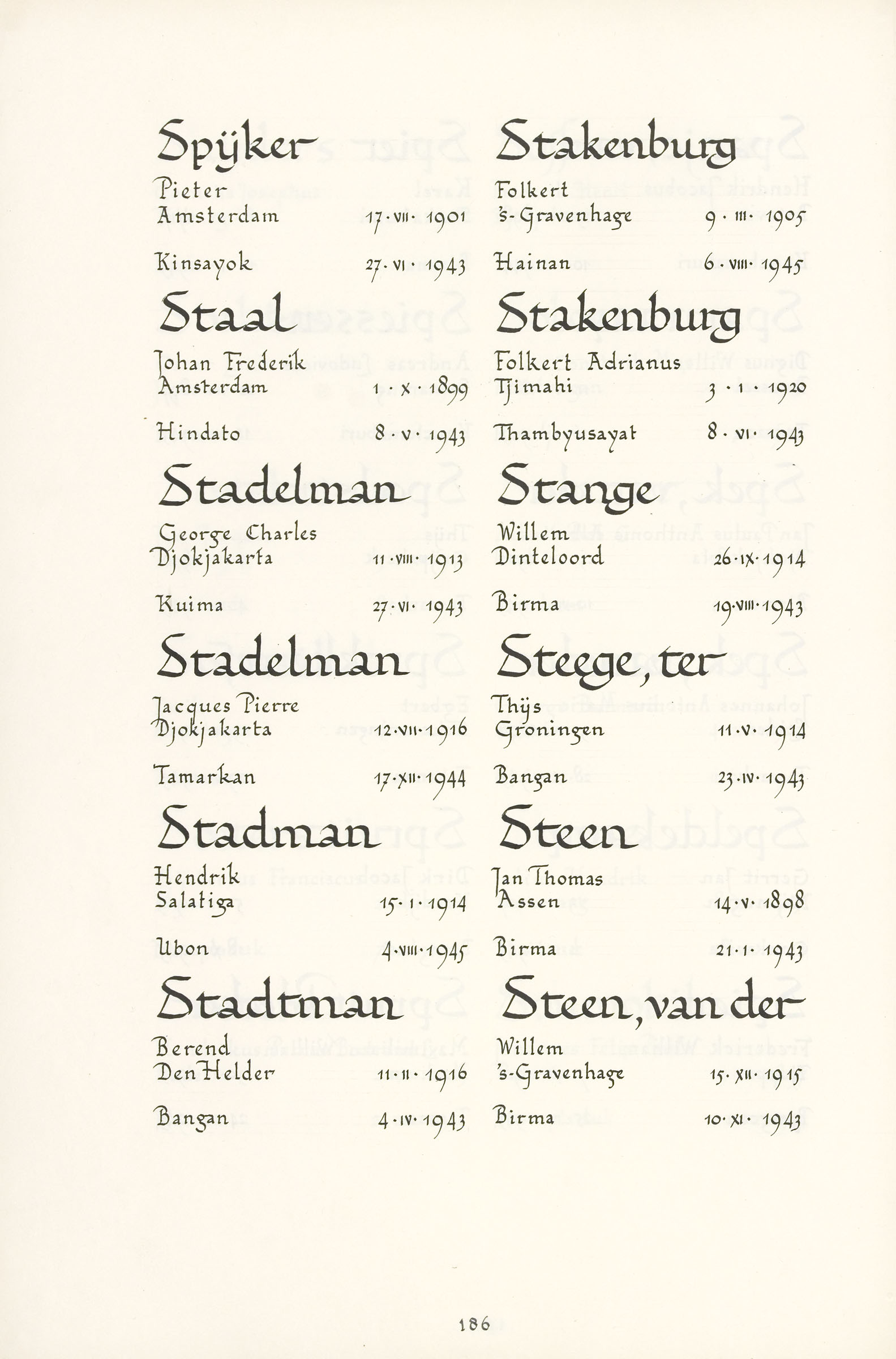 George Charles Stadelman Geboortedatum: 11-08-1913 Geboorteplaats: Djokjakarta Datum van overlijden: 27-06-1943 Plaats van overlijden: Kwima (Thailand) Beroep: Sergeant Groep: Koninklijk Nederlands-Indisch Leger en Indisch Verzet Pagina: 186 Reactie toevoegen JavaScript moet ingeschakeld zijn om dit formulier te kunnen gebruiken. Comment Over tekstopmaak Platte tekst Geen HTML toegestaan. Regels en alinea's worden automatisch gesplitst. Web- en e-mailadressen worden automatisch naar links omgezet. Laat dit veld leeg blader download Permalink