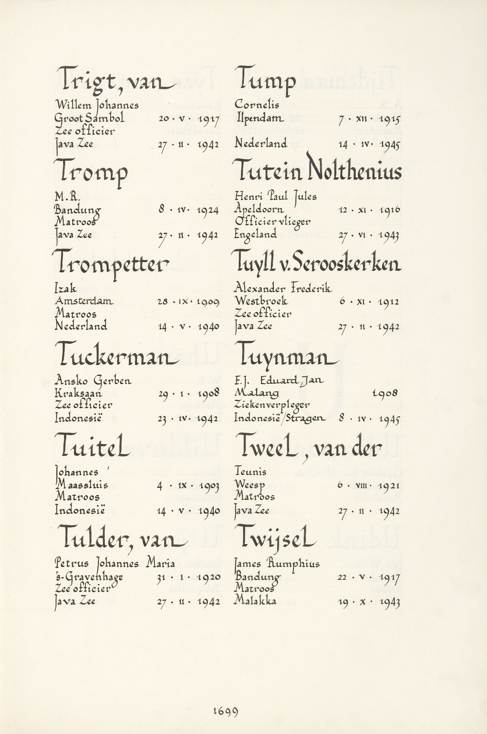 James Rumphius Twijsel Geboortedatum: 22-05-1917 Geboorteplaats: Bandoeng Datum van overlijden: 18-09-1943 Plaats van overlijden: Tarsao (Thailand) Beroep: Matroos Groep: Koninklijke Marine Pagina: 1699 Reactie toevoegen JavaScript moet ingeschakeld zijn om dit formulier te kunnen gebruiken. Comment Over tekstopmaak Platte tekst Geen HTML toegestaan. Regels en alinea's worden automatisch gesplitst. Web- en e-mailadressen worden automatisch naar links omgezet. Laat dit veld leeg blader download Permalink