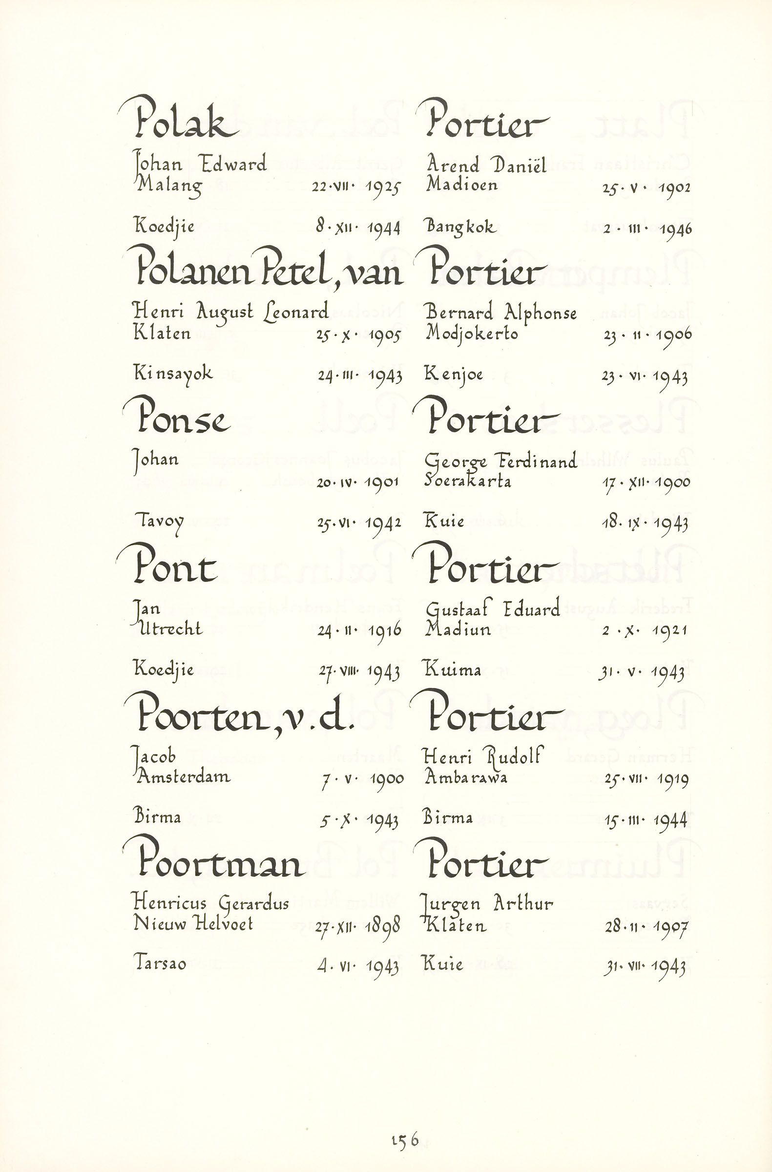 Johan Ponse Geboortedatum: 20-04-1901 Geboorteplaats: onbekend Datum van overlijden: 25-06-1942 Plaats van overlijden: Tavoy (Birma) Beroep: Sergeant Groep: Koninklijk Nederlands-Indisch Leger en Indisch Verzet Pagina: 156 Reactie toevoegen JavaScript moet ingeschakeld zijn om dit formulier te kunnen gebruiken. Comment Over tekstopmaak Platte tekst Geen HTML toegestaan. Regels en alinea's worden automatisch gesplitst. Web- en e-mailadressen worden automatisch naar links omgezet. Laat dit veld leeg blader download Permalink