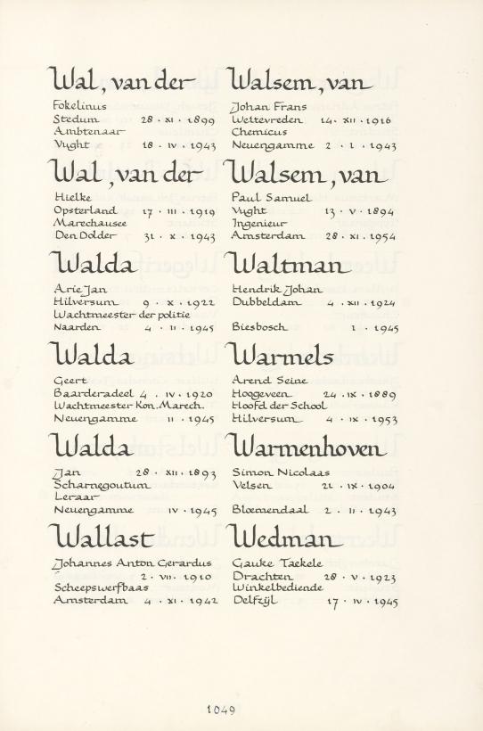 Johan Frans van Walsem Geboortedatum: 14-12-1916 Geboorteplaats: Weltevreden Datum van overlijden: 02-01-1943 Plaats van overlijden: Neuengamme Beroep: Chemicus Groep: Verzet Pagina: 1049 Reactie toevoegen JavaScript moet ingeschakeld zijn om dit formulier te kunnen gebruiken. Comment Over tekstopmaak Platte tekst Geen HTML toegestaan. Regels en alinea's worden automatisch gesplitst. Web- en e-mailadressen worden automatisch naar links omgezet. Laat dit veld leeg blader download Permalink