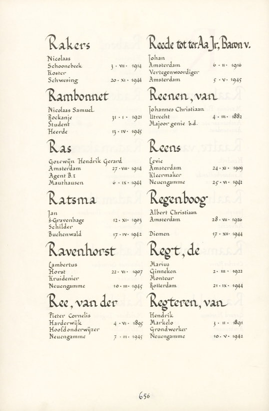 Nicolaas Samuel Rambonnet Geboortedatum: 31-01-1921 Geboorteplaats: Rockanje Datum van overlijden: 13-04-1945 Plaats van overlijden: Heerde Beroep: Student Groep: Verzet Pagina: 656 Bas van den Boomgaard caro rambonnet lucius groenen Wouter van Dooren Ben Langendoen Reactie toevoegen JavaScript moet ingeschakeld zijn om dit formulier te kunnen gebruiken. Comment Over tekstopmaak Platte tekst Geen HTML toegestaan. Regels en alinea's worden automatisch gesplitst. Web- en e-mailadressen worden automatisch naar links omgezet. Laat dit veld leeg blader download Permalink