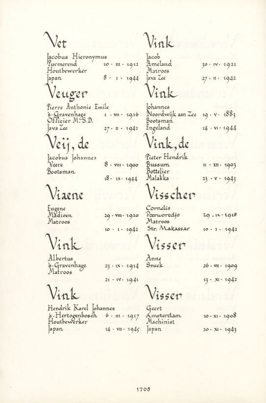 Pieter Hendrik de Vink Geboortedatum: 11-12-1903 Geboorteplaats: Bussum Datum van overlijden: 23-05-1943 Plaats van overlijden: Malakka Beroep: Bottelier Groep: Koninklijke Marine Pagina: 1708 Reactie toevoegen JavaScript moet ingeschakeld zijn om dit formulier te kunnen gebruiken. Comment Over tekstopmaak Platte tekst Geen HTML toegestaan. Regels en alinea's worden automatisch gesplitst. Web- en e-mailadressen worden automatisch naar links omgezet. Laat dit veld leeg blader download Permalink