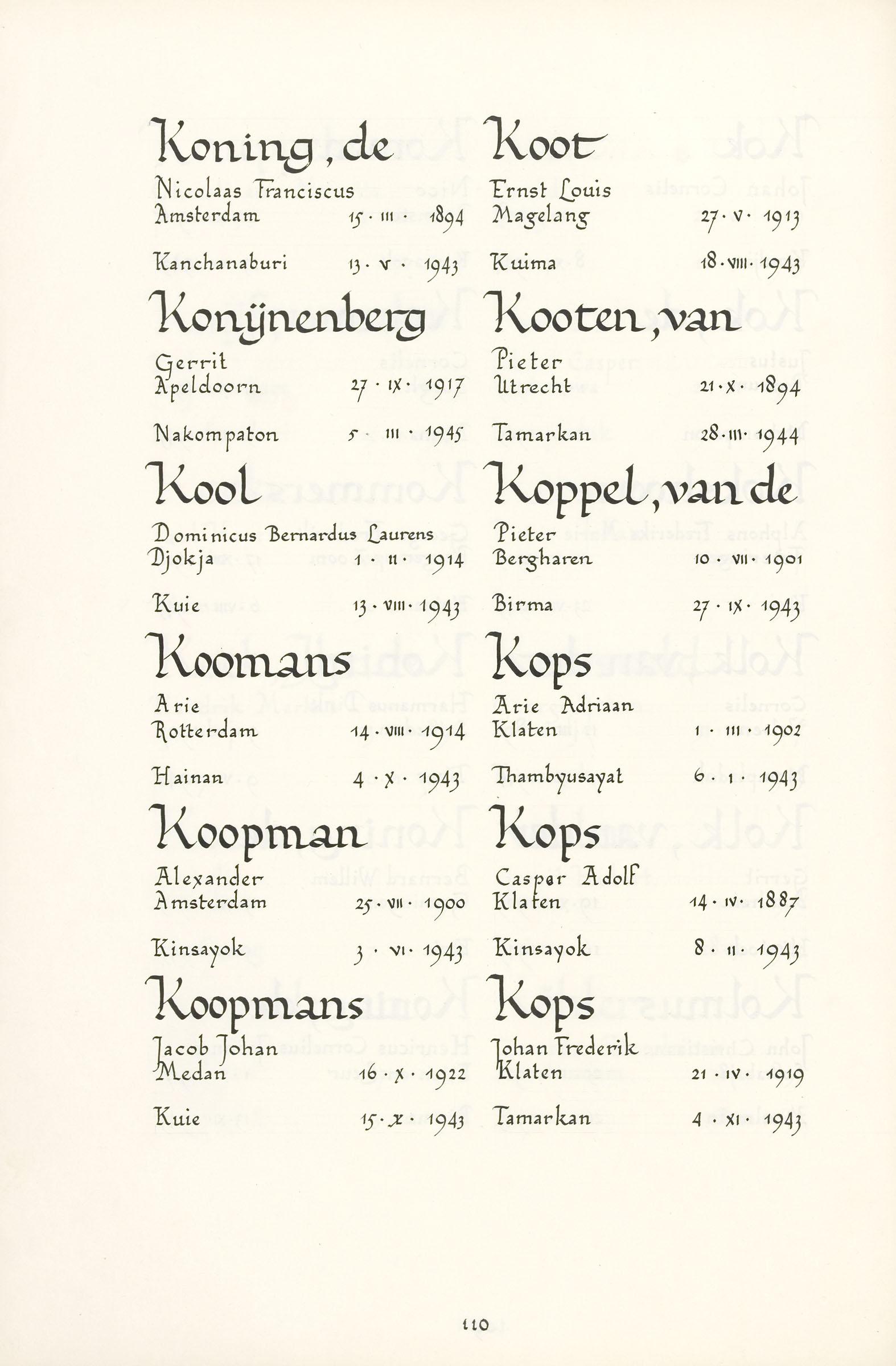 Pieter van Kooten Geboortedatum: 21-10-1894 Geboorteplaats: Utrecht Datum van overlijden: 28-03-1944 Plaats van overlijden: Tamarkan (Thailand) Beroep: Adjudant Onderofficier Groep: Koninklijk Nederlands-Indisch Leger en Indisch Verzet Pagina: 110 Nico van Kooten Claudia van Kooten Claudia van Kooten Reactie toevoegen JavaScript moet ingeschakeld zijn om dit formulier te kunnen gebruiken. Comment Over tekstopmaak Platte tekst Geen HTML toegestaan. Regels en alinea's worden automatisch gesplitst. Web- en e-mailadressen worden automatisch naar links omgezet. Laat dit veld leeg blader download Permalink
