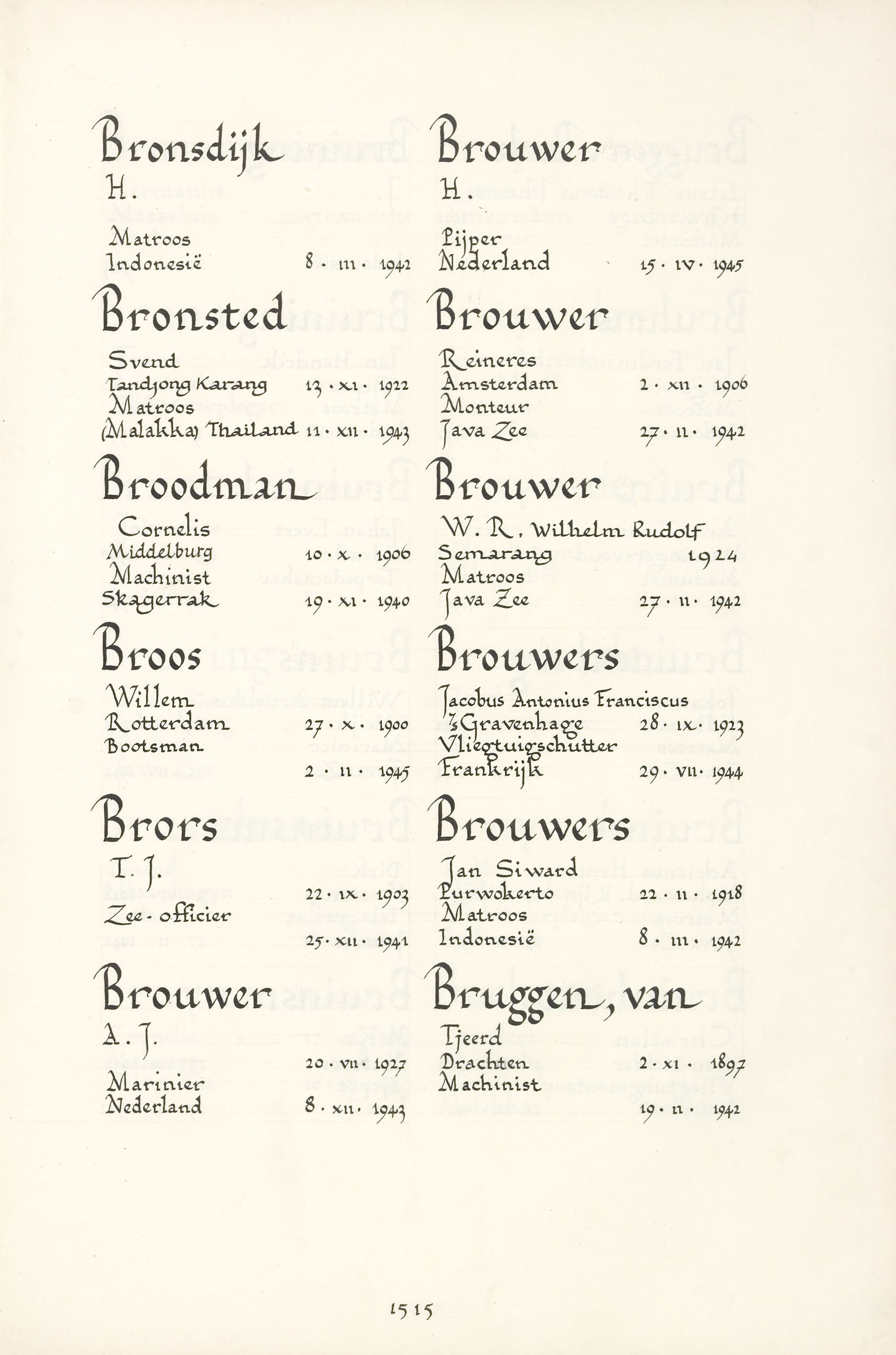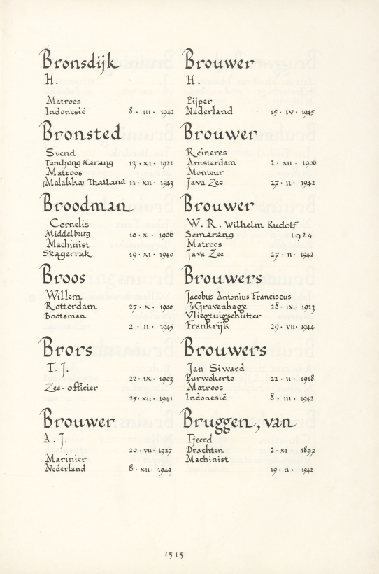 Wilhelm Rudolf Brouwer Geboortedatum: 03-01-1925 Geboorteplaats: Semarang (Java) Datum van overlijden: 27-02-1942 Plaats van overlijden: Javazee Beroep: Matroos Groep: Koninklijke Marine Pagina: 1515 Klaas Brouwer Reactie toevoegen JavaScript moet ingeschakeld zijn om dit formulier te kunnen gebruiken. Comment Over tekstopmaak Platte tekst Geen HTML toegestaan. Regels en alinea's worden automatisch gesplitst. Web- en e-mailadressen worden automatisch naar links omgezet. Laat dit veld leeg blader download Permalink
